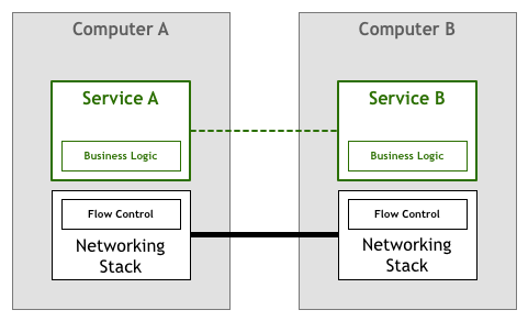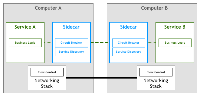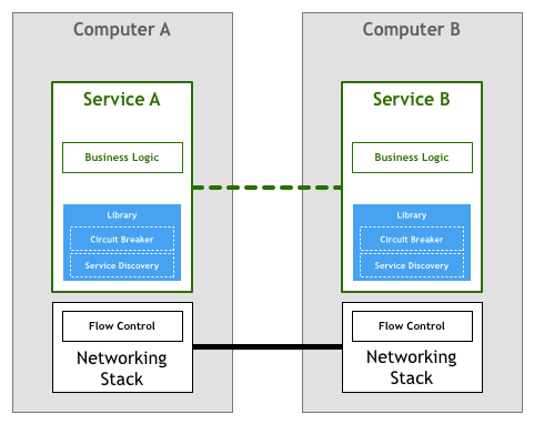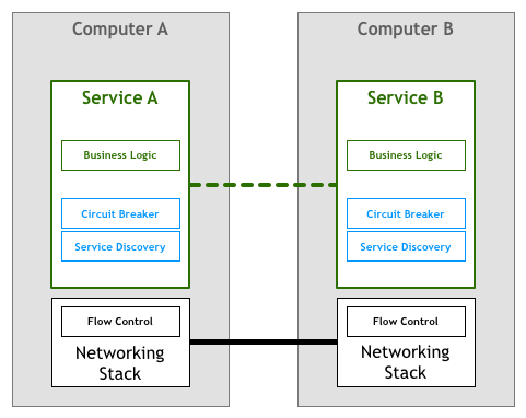 當機器越來越普及,工程師們開始思考如何解決多個連線、資料加密、服務發現等問題,以實現一個 Network System。因此機器開始需要實現一個名為 Flow Control 的邏輯,用來確認傳輸的速度不會大於接收的速度、處理網路傳輸的資料遺失、資料加密等等問題。因此,服務中除了實現 Business Logic,還開始需要實現 Flow Control。